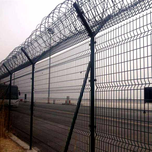 機場剛絲網圍界又稱作“Y型安全防御護網”,機場隔離柵、飛機場護欄網是由V型支架立柱,加強型焊接片網,安全防盜連接件和熱鍍鋅刀
