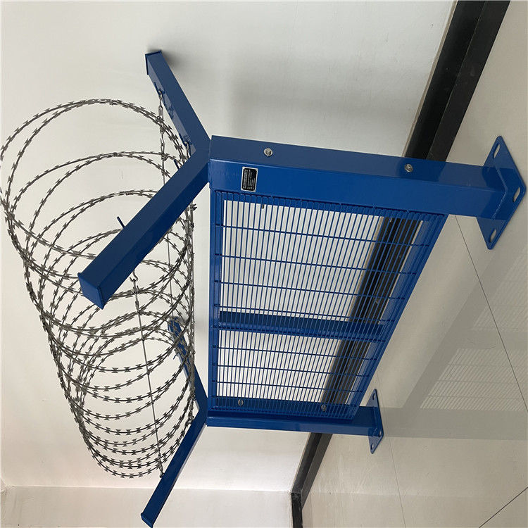 監獄358加密防護網配件:一般配有方柱60x60mmx3mm 跟護欄網片同樣的表面處理方式,通過螺絲將網片和柱子連接起來,可以預埋或者是通過法蘭盤與水泥地面固定,護欄頂部可以通過Y型柱配有刀片刺繩,普通刺繩,進一步起到防護作用
