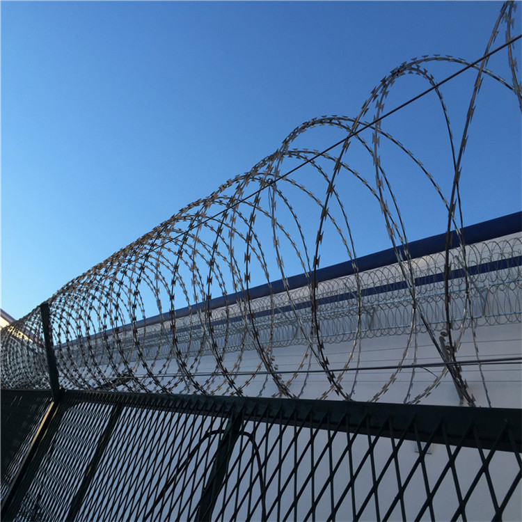 螺旋交叉型刀片刺繩是相鄰的兩圈刀片刺繩交錯用卡扣連接到一起,展開后即成交叉狀,大大縮短了兩環之間的空隙,更好的起到了防護作用,安裝過程中需要在刀片刺繩圈內拉鋼絲,以便起到更好的穩固作用。 螺旋交叉刀片刺網比螺旋單一型刀片刺網安全級別更高,螺旋交叉刀片刺網被廣泛應用于工業安全,中低級別設防的監獄。螺旋交叉刀片刺網可是加工成不同外徑規格(450mm、600mm、700mm、900mm),刀片類型和規格可根據客戶的實際需求量身定做。通常用于生產交叉型的有BTO-10、BTO-22。