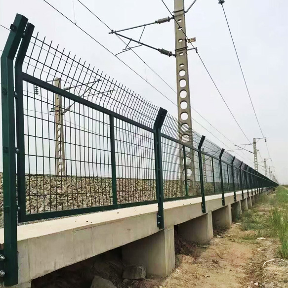 鐵路圍檔-鐵路防護圍欄又叫鐵路隔離網是重要的交通基礎設施,所以在安全性與實用性的要求上更加的嚴格。整個鐵路封閉網采用優質低碳鋼絲或不銹鋼絲編焊而成,其大致結構可分為立柱+邊框,連接方式可以通過連接件連接,也可以用網片直接與立柱卡接、螺栓連接和連接件鉚接,角度可任意調整。