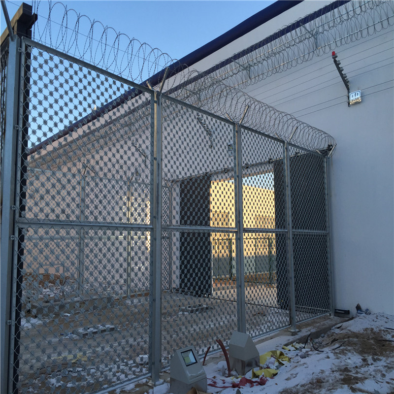 監(jiān)獄防護(hù)網(wǎng)網(wǎng)絲材質(zhì)都是選用Q235碳素鋼,1、網(wǎng)格大小:50mm×150mm堅密格型網(wǎng)加三道折彎,加固定框2、網(wǎng)片固定框:20×20×1.5mm國標(biāo)方鋼管,增加一道垂直中稱3、網(wǎng)絲直徑:5mm,網(wǎng)片尺寸:2000mm-2500mm(可根據(jù)實際可用空間合理調(diào)整)。4、立柱規(guī)格:Y型柱直徑60mm×60mm×2.5mm方鋼。5、柱與網(wǎng)框連接方式:防盜螺絲貫穿式連接。6、網(wǎng)片頂端安裝刀片刺繩:芯絲直徑2.5mm、刀長21mm,刀寬15mm,刀片刺繩直徑500mm-600mm。
